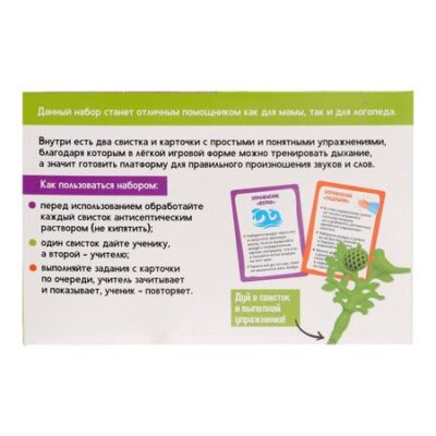 Тренажер для дыхания «Звонкие птички». Тренажер для дыхания «Звонкие птички» — отличный помощник для мамы и логопеда. Внутри набора вы обнаружите 2 свистка и карточки с интересными развивающими заданиями. Они помогут малышу потренировать дыхание и правильно произносить звуки, буквы, слоги и слова. <b> Как играть?</b> <ol> <li> Перед использованием обработайте каждый свисток антисептическим раствором (не кипятите).</li> <li> Один свисток дайте ученику, другой — учителю.</li> <li> Дуйте в свисток и выполняйте упражнение: учитель зачитывает задание с карточки и показывает, что делать, ученик повторяет за ним.</li> </ol> Игра рекомендована детям старше 3 лет и рассчитана на 2 участников. <b> Играй и выдыхай, произношение развивай!</b>