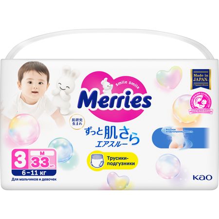Трусики-подгузники для детей Merries размер M / 3 (6-11 кг), 33 шт, дышащие
