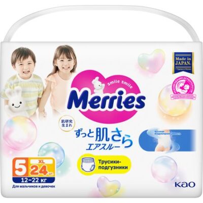 Трусики-подгузники для детей Merries размер XL / 5 (12-22 кг), 24 шт, дышащие