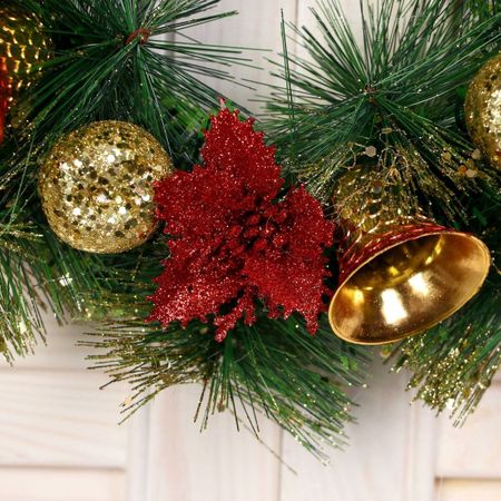 Венок новогодний d=25 см «Зимнее волшебство. Красные цветы и колокольчики». Прекрасный венок добавит нотки роскоши в Ваш интерьер. Декор станет замечательным акцентом и создаст атмосферу уюта и тепла. <b> Особенности</b> <ul> <li> Элегантный дизайн подходит для любых стилей интерьера.</li> <li> Изготовлен из прочного пластика, что гарантирует долгий срок службы и простоту в уходе.</li> <li> Размер 25 см позволяет использовать венок для оформления разных пространств – от дверей до столов.</li> </ul> Создайте праздничное настроение!