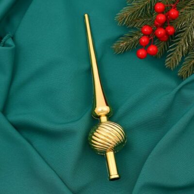 Верхушка на елку «Классика полосы» 25 см, золотистый. Новогодний топпер «Классика с полосами» — завершающий акцент для праздничной елки, сочетающий строгость линий и торжественность золота. Верхушка высотой 25 см выполнена в классическом стиле с отсылками к новогоднему барокко, советскому дизайну и ар-деко. Ее золотистый цвет и четкие узоры создают ощущение зимней роскоши без излишеств. <b> Дизайн и форма</b> <ul> <li> <strong> Золотистый оттенок:</strong> Ловит свет гирлянд, придает интерьеру теплоту и нарядность.</li> <li> <strong> Форма – наконечник на елку:</strong> Четко завершает образ дерева и становится центральным элементом композиции.</li> <li> <strong> Однотонный дизайн:</strong> Подчеркивает лаконичность формы и делает украшение универсальным.</li> <li> <strong> Материал – пластик:</strong> Прочный, легкий и устойчивый к деформации, сохраняется в идеальном состоянии год за годом.</li> <li> <strong> Стилистическая гибкость:</strong> Украшение подходит как для традиционного оформления, так и для современных интерьерных решений.</li> </ul> <b> Праздничный финал</b> Этот топпер — не просто верхушка, а законченная нота новогоднего декора. Его золотой блеск напоминает первый луч солнца сквозь морозное утро или сияние далекой рождественской звезды. Размер в 25 см делает его подходящим как для больших, так и для мини-елок — он остается ярким и заметным акцентом, не нарушая пропорций.