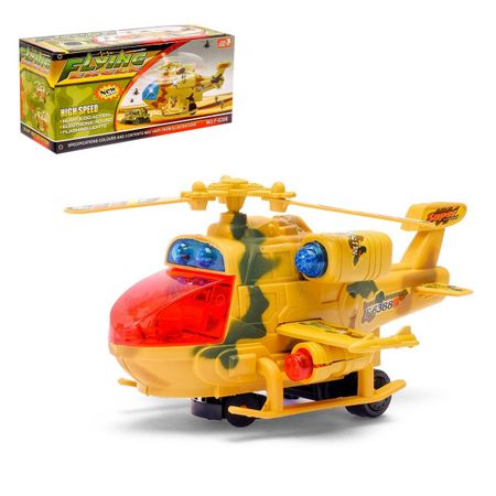 Вертолет «Воздушный бой», световые и звуковые эффекты, работает от батареек. <b> Вперед к победе! </b> Вражеские войска начали атаку с воздуха. Необходимо срочно отразить удар и переломить исход битвы! На маневренном вертолете «Воздушный бой» мальчишка вступит в сражение с противником и непременно одержит победу. Военный дизайн авиамодели и яркие эффекты с первых секунд завладеют вниманием ребенка и сделают игру увлекательней и реалистичней: вертолет светится и воспроизводит шум двигателя. <b> Неоспоримая польза </b> Такая игрушка пробудит воображение малыша и доставит море положительных эмоций, чадо разовьет пространственное и логическое мышление, координацию движений и эмоциональное восприятие. В изделии используются 2 батарейки типа АА, в комплектацию не входят. Для детей старше 3 лет.