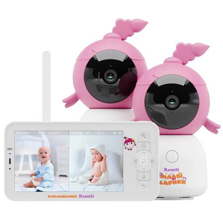 Дизайн этой видеоняни Ramili Baby RV100X2NUSHA выполнен по мотивам серии популярных мультфильмов для самых маленьких зрителей – Малышарики. Уникальный и забавный дизайн камеры порадует малыша и отлично впишется в интерьер любой детской комнаты. Видеоняня может работать непрерывно в режиме 24/7, обеспечивая высокую безопасность защищённой связи. Родители могут быть уверены, малыш находится под чутким контролем устройства, оснащённого современными компонентами и надёжным программным обеспечением. Видеоняня изготовлена из тщательно подобранных материалов с соблюдением современных стандартов. Она контролирует звук, движение, температуру и влажность в детской комнате. Оповещает о происходящем, подавая сигналы, когда малышу требуется внимание родителей. Особенности Функциональность В комплект видеоняни входит монитор и 2 камеры. Функция обнаружением движения и датчик звука оповещают родителей, если малыш проснётся. В камеру встроен многоцветный ночничок, который наполняет детскую комнату мягким LED-светом, помогая малышу спокойно заснуть. Предусмотрены термометр, гигрометр для измерения влажности и возможность записывать видео на карту памяти Удалённое управление Дальность между блоками при оптимальных условиях беспроводной связи может достигать 300 метров. Для мониторинга на более удалённом расстоянии обе камеры видеоняни можно подключить к домашней сети Wi-Fi, а затем наблюдать или общаться с малышом через удобное приложение на вашем смартфоне или планшете из любой точки мира через интернет Угол обзора Поворотная камера с широким углом обзора 110° в пассивном положении, угол обзора при повороте 360° по горизонтали, 165° по вертикали Удобный родительский блок Удобная подставка для вертикального расположения родительского блока. На родительском блоке предусмотрена выдвижная антенна для усиления приёма сигнала в сложных условиях связи Удобное крепление В комплект видеоняни входит удобное гибкое крепление для камеры. Его можно использовать для крепления к кроватке, а также к ручке коляски во время прогулки. Чтобы поворотная камера могла работать без подключения к розетке, просто подключите её к портативному аккумулятору Power Bank (приобретается отдельно)