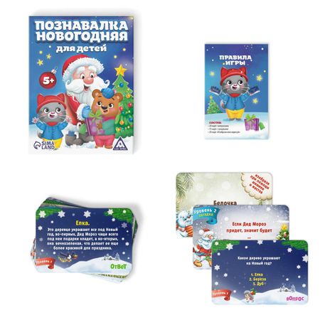 Викторина «Новогодняя познавалка для детей», 55 карточек, 5+. <b> Новый год – пора чудес! </b> Интересные вопросы о самом чудесном времени года, веселые загадки и громкий смех. Что же происходит? Это дети играют в «Новогоднюю познавалку»! Ваш малыш сможет блеснуть своими знаниями в игре-викторине и от души повеселиться, ведь Новый год – это самый лучший праздник! <b> Хочу все знать! </b> Эта игра состоит из карточек. Все они делятся на 3 уровня. В первом – вас ждет увлекательная викторина с новогодними вопросами, во втором – веселые загадки про зимнее время года, а в третьем – нужно использовать весь свой артистизм, ведь здесь нужно объяснять слова с помощью мимики и жестов. Играть понравится и взрослым, и детям – это лучший способ отлично провести время, проявить смекалку и развить творческие способности. <b> Что внутри: </b> <ul> <li> 55 карточек, </li> <li> правила игры. </li> </ul> <b> Пусть этот праздник запомнится надолго! </b>
