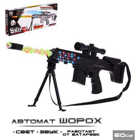 Винтовка «Снайпер», свет, звук, работает от батареек. Винтовка «Снайпер» — идеальная игрушка для юных любителей приключений и активных игр. Она впечатлит своим реалистичным дизайном, световыми и звуковыми эффектами, а также простотой в использовании. <strong> Особенности</strong> <ul> <li> Подходит для детей от 3 лет.</li> <li> Реалистичные эффекты: светящиеся элементы и звуки стрельбы добавляют атмосферы.</li> <li> Работает от батареек (3 шт. типа АА), что делает ее простой в использовании.</li> <li> Длина винтовки: 60 см — комфортно держать и стрелять.</li> <li> Тренога и ремень в комплекте, для удобства прицеливания и ношения.</li> </ul> <strong> Игра и польза</strong> <ul> <li> Развивает координацию движений.</li> <li> Улучшает фантазию и сюжетное мышление.</li> <li> Способствует активным играм и взаимодействию с друзьями.</li> </ul> Станет отличным выбором для подарка и подарит много радости и захватывающих моментов!