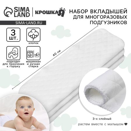 Вкладыши в многоразовый подгузник Крошка Я, 3-х слойный, 40 см, 3 шт., хлопок. Поддержание личной гигиены является важной и необходимой частью ежедневного ухода за любимой крохой. Вкладыш в многоразовый подгузник — это именно та вещь, которая поможет родителям заботиться о ребенке, чтобы он всегда оставался чистым и здоровым. Изделие создано из ЭКО хлопка и безопасно для малыша.