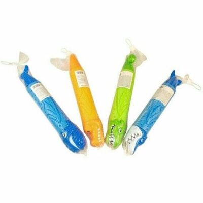 Водное помповое оружие. В ассортименте 4 вида: акула, крокодил, дракон, кашалот. Голова (наконечник) и хвост (ручка) игрушки выполнены из пластика, корпус – из ПВХ. Оружие погружается в емкость с водою, и посредством оттягивания ручки на себя вода набирается в резервуар. Для осуществления выстрела необходимо толкать ручку оружия в направлении от себя. Размер игрушки составляет 34х5х5 см.