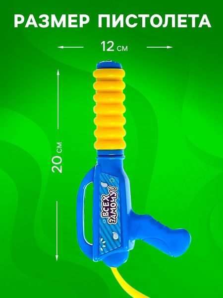 Водный пистолет «Всех замочу!», ранец-баллон. С детским пистолетом «Всех замочу» ребенок сможет устроить настоящее водное сражение! Ранец-баллон станет любимой игрушкой маленького солдата в жаркую погоду, ведь он не только поможет увлекательно провести время с друзьями на свежем воздухе, но и спасет от перегревания. <b> Особенности</b> <ul> <li> Вместимость резервуара рюкзака — 1,2 литра.</li> <li> Дальность стрельбы детского пистолета — до 10 метров.</li> <li> Для осуществления стрельбы необходимо создать давление помпой. Пистолет не имеет курка — дуло качает воду, как насос.</li> <li> Игрушка сделана из высококачественного нетоксичного пластика, который полностью безопасен для детей.</li> </ul>