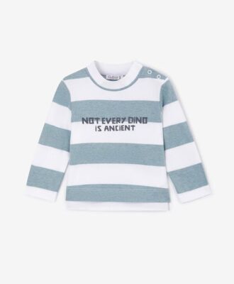 Один из самых универсальных предметов гардероба в осенне-зимний период! Водолазка в голубую и белую полоску выполнена из хлопкового трикотажа. Дизайн модели построен на сочетании лаконичной полоски, контрастных налокотников и текстового принта «Not every dino is ancient» («Не каждый динозавр древний»). Мягкая и очень приятная тактильно, водолазка обеспечит максимальный комфорт в холодный день. Застёжка на кнопки облегчит процесс сборов на прогулку.