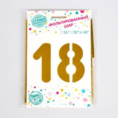 Воздушные шары фольгированные 40" «18 лет», цифры. Фольгированный шар «18 лет» золотого цвета — это яркое и стильное украшение для празднования совершеннолетия. Шар высотой 40 дюймов (примерно 102 см) идеально подойдет для оформления зала, фотозоны или места торжества, подчеркивая важность этого события. Яркий золотой цвет и крупные цифры «18» привлекают внимание и создают праздничное настроение. <b> Преимущества и особенности</b> <ul> <li> Высота 40 дюймов — крупный размер, подходящий для эффектного декора и фотозон.</li> <li> Золотой цвет — добавляет торжественности и роскоши в оформление праздника.</li> <li> Подходит для наполнения гелием или воздухом — можно создать парящий эффект или закрепить в нужной зоне.</li> <li> Прочный фольгированный материал — долговечен и устойчив к нагрузкам, сохраняет форму в течение всего торжества.</li> </ul> <b> Идеальное украшение для праздника</b> Шар «18 лет» — идеальный выбор для создания особенной атмосферы на дне рождения. Легкий в использовании и универсальный, он подойдет как для домашних праздников, так и для масштабных мероприятий, добавляя яркости и стильности в каждый уголок праздника.