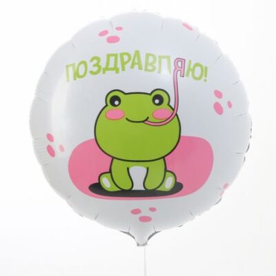 Воздушный шар фольгированный 18" «Поздравляю», круг, с подложкой. Фольгированный шар с надписью: «Поздравляю!» и принтом с лягушкой — дополнение, которое подойдет к любому подарку для ребенка! Вы можете взять несколько шаров и соорудить из них арку или гирлянду. Воздушные шары — простой и удобный способ оформить помещение для мероприятия. <b> Особенности</b> <ul> <li> Размер шара — 18 дюймов (45 сантиметров).</li> <li> Шар подходит для надувания воздухом и гелием.</li> <li> Преимущество фольгированных шаров — их не нужно обрабатывать специальным раствором перед надуванием гелием.</li> <li> Чтобы шар не деформировался избегайте воздействия прямых солнечных лучей, повышенной влажности и перепада температуры.</li> </ul>