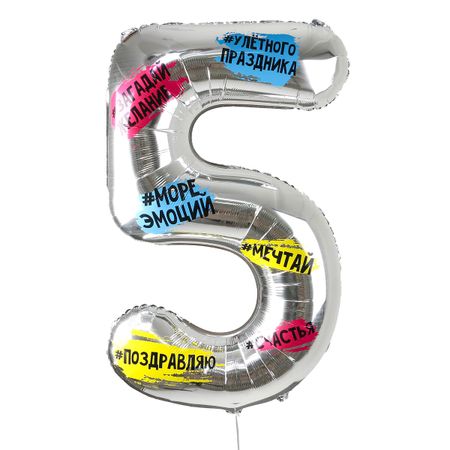Воздушный шар фольгированный 34" «Цифра 5», с подложкой. Фольгированный шар в виде цифры с хештегами — оригинальный способ поздравить с днем рождения. При необходимости, соберите число из двух шаров-цифр. Отлично подойдет в качестве реквизита для фотосессии или оформления помещения. <b> Особенности</b> <ul> <li> Размер шара — 34 дюйма (85 см).</li> <li> Шар подойдет для надувания гелием или воздухом.</li> <li> Перед надуванием шары рекомендуется обработать специальным составом для более длительного пользования.</li> <li> Чтобы шар не деформировался избегайте воздействия прямых солнечных лучей, повышенной влажности и перепада температуры.</li> </ul>