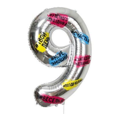 Воздушный шар фольгированный 34" «Цифра 9», с подложкой. Фольгированный шар в виде цифры с хештегами — оригинальный способ поздравить с днем рождения. При необходимости, соберите число из двух шаров-цифр. Отлично подойдет в качестве реквизита для фотосессии или оформления помещения. <b> Особенности</b> <ul> <li> Размер шара — 34 дюйма (85 см).</li> <li> Шар подойдет для надувания гелием или воздухом.</li> <li> Перед надуванием шары рекомендуется обработать специальным составом для более длительного пользования.</li> <li> Чтобы шар не деформировался избегайте воздействия прямых солнечных лучей, повышенной влажности и перепада температуры.</li> </ul>