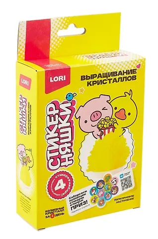 Выращивание кристаллов Стикерняшки «Попкорновое настроение», жёлтый кристалл. Комплектация: Раствор карбамида и поливинилового спирта с красителем, поддон для выращивания, картонная основа, декоративный картонный элемент, инструкция, стикеры 4 шт.