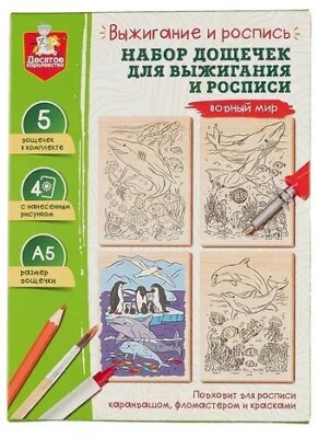 Выжигание по дереву — весьма распространенный вид прикладного искусства. Дощечка для выжигания и росписи «Водный мир» — это замечательный подарок для любого ребенка, который поможет интересно провести время и реализовать свои творческие способности. Рисунок нанесен специальной краской, которая не выделяет вредные вещества в процессе выжигания.