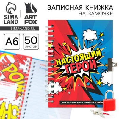 Записная книжка на замочке А6, 50 л. «Настоящий герой». Откройте для себя идеальный блокнот для всех ваших задач! Этот аксессуар сочетает в себе современный дизайн и практичность, а универсальный формат и качественная бумага делают его идеальным выбором как для деловых заметок, так и для творческих экспериментов. Особенности, которые вас порадуют: <ul> <li> 50 листов;</li> <li> Плотность бумаги 65 г/м² — идеально подходит для письма любыми чернилами;</li> <li> Удобное крепление на гребне позволяет легко перелистывать страницы;</li> <li> Твердая обложка, защищает содержимое и приятно лежит в руке;</li> <li> Компактный формат А6 удобно брать с собой.</li> </ul> Создавайте, планируйте и мечтайте с удовольствием, а этот практичный блокнот станет вашим верным спутником в любых задачах!