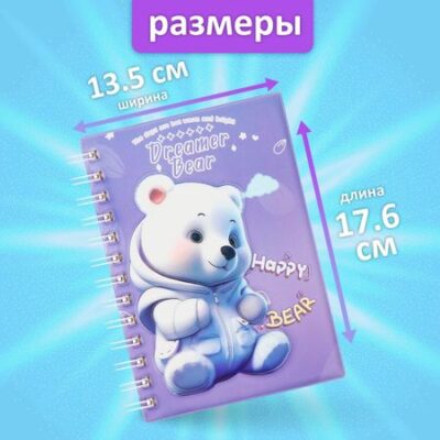 Записная книжка подарочная на гребне 80л,линия, цветной блок,обложка ПВХ 3D Мишка(17,6х13,5см) 105.