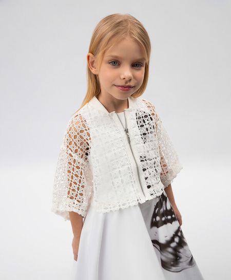 Что может дополнить нарядные образы лучше, чем белый укороченный жакет из кружева с объемными рукавами? Фактурный формоустойчивый материал смотрится очень изысканно и свежо. Жакет не только дополнит нарядные образы из капсулы Gulliver «Лемонграсс», но и красиво завершит повседневные комплекты с брюками, шортами, топами, внеся в них нотку модной эклектики. Жакет застёгивается на молнию.
