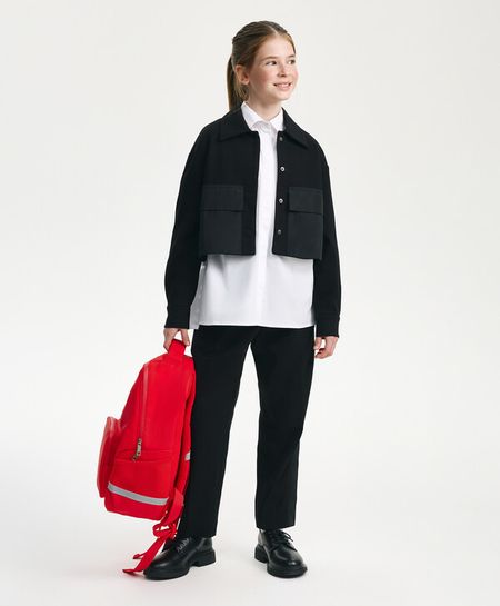 Черный укороченный жакет – яркая стильная вещь, способная сформировать современные пропорции в образе девочки. Школьный жакет выполнен из мягкого формоустойчивого джерси на основе вискозы. Объемные накладные карманы с клапанами, выполненные из плащовки, создают интересную игру фактур и подчеркивают трендовый дизайн модели. Жакет пластичен, практичен, прост в уходе и эксплуатации. Шелковистая подкладка создает комфортное скольжение при взаимодействии с вещами первого слоя. Жакет застегивается на скрытые кнопки. Он легко комбинируется с юбками, брюками и платьями, отлично вписываясь и в многослойные школьные образы, и в модные повседневные аутфиты.