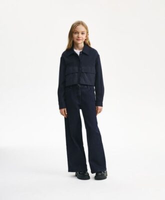 Темно-синий укороченный жакет – яркая стильная вещь, способная сформировать современные пропорции в образе девочки. Школьный жакет выполнен из мягкого формоустойчивого джерси на основе вискозы. Объемные накладные карманы с клапанами, выполненные из плащовки, создают интересную игру фактур и подчеркивают трендовый дизайн модели. Жакет пластичен, практичен, прост в уходе и эксплуатации. Шелковистая подкладка создает комфортное скольжение при взаимодействии с вещами первого слоя. Жакет застегивается на скрытые кнопки. Он легко комбинируется с юбками, брюками и платьями, отлично вписываясь и в многослойные школьные образы, и в модные повседневные аутфиты.