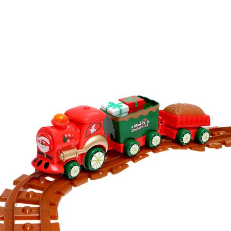 Железная дорога «Новогодний поезд», световые и звуковые эффекты, работает от батареек, 3+. Поезд Деда Мороза отправляется в путешествие! Игрушка поможет скоротать время в ожидании праздника и потренировать полезные навыки. <b> Как собрать железную дорогу</b> <ol> <li> Соберите трассу.</li> <li> Вставьте в локомотив 3 батарейки типа АА (в комплектацию не входят).</li> <li> Присоедините вагоны к поезду.</li> <li> Поместите состав на рельсы и начните игру.</li> </ol> <b> Чем полезны игры с железной дорогой</b> Управляя вагонами, ребенок разовьет воображение, образное и пространственное мышление, координацию движений и мелкую моторику рук. Игрушка предназначена для детей старше 3 лет.