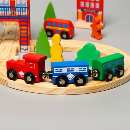 Железная дорога «Путешествие», 36 деталей, 24×18.5×13.5 см. Деревянная железная дорога «Путешествие» — это увлекательный игровой набор для детей от 3 лет. В комплекте 36 деталей, включая локомотив и три вагона, которые легко собираются в яркую мультяшную композицию. Идеально подходит для развития воображения и мелкой моторики. <b> Особенности набора</b> <ul> <li> Длина пути — 24 см, что удобно для игры на столе или полу.</li> <li> Материал путей и деталей — экологичное дерево, безопасное для детей.</li> <li> Компактная упаковка-контейнер для удобного хранения и транспортировки.</li> </ul> <b> Преимущества</b> Набор создан для тех, кто ценит простоту и качество. Деревянные детали приятны на ощупь, а яркий дизайн привлекает внимание. Ребенок сможет самостоятельно собирать и разбирать дорогу, развивая логику и пространственное мышление. Это отличный подарок для маленьких любителей поездов и приключений.