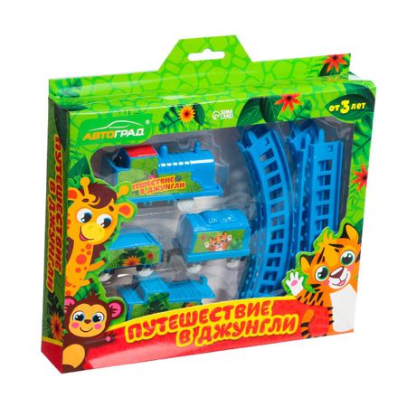 Железная дорога «Путешествие в джунгли». Вперед — навстречу приключениям! Железная дорога «Путешествие в джунгли» подарит ребенку яркие эмоции. Его ждет увлекательное путешествие вместе с веселыми зверятами. Скорее собирайте железную дорогу, сцепляйте составы и отправляйтесь в путь! <b> Особенности железной дороги</b> <ul> <li> Все элементы набора выполнены из качественного пластика.</li> <li> Путь собирается в форме овала, длина большой полуоси — 44 см.</li> <li> Локомотив работает от 1 батарейки типа AA. Элемент питания в комплект не входит.</li> <li> Размер локомотива: 9 × 3 × 5 см.</li> <li> Размер вагонов: 5,5 × 3 × 4 см.</li> <li> Ширина пути — 2,5 см.</li> <li> Рекомендовано детям от 3 лет.</li> </ul>
