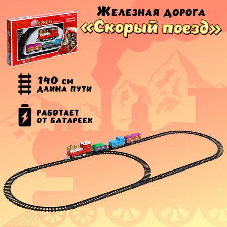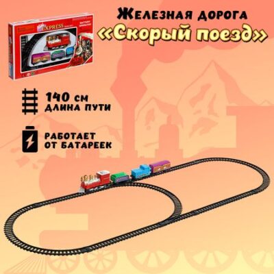 Железная дорога «Скорый поезд», работает от батареек. Полный вперед к новым приключениям! Железная дорога с самоходным паровозом – это яркий и увлекательный набор, который перенесет вашего ребенка в мир путешествий и открытий. Станьте машинистом и отправляйтесь в путь! <ul> <li> Самоходный паровоз: просто вставьте 1 батарейку типа AA (приобретается отдельно), и поезд начнет движение по рельсам. Ребенок может наблюдать за маршрутом или добавлять свои истории к путешествию.</li> <li> В комплект входит классический паровоз и три вагона, которые можно загружать или использовать для перевозки воображаемых грузов. Это добавляет игре реализма и открывает простор для творчества.</li> <li> Прочные материалы: рельсы и состав выполнены из качественного пластика и металла, которые выдерживают активные игры. Легкие детали удобно собирать и разбирать, а золотистый цвет привлекает внимание и радует глаз.</li> <li> Длина пути — 140 см.</li> </ul> Что развивает: этот поезд помогает развивать воображение, координацию движений и навыки конструирования. Ребенок может придумывать истории о путешествиях, перевозке грузов или даже спасательных операциях. Это не только весело, но и полезно для развития.