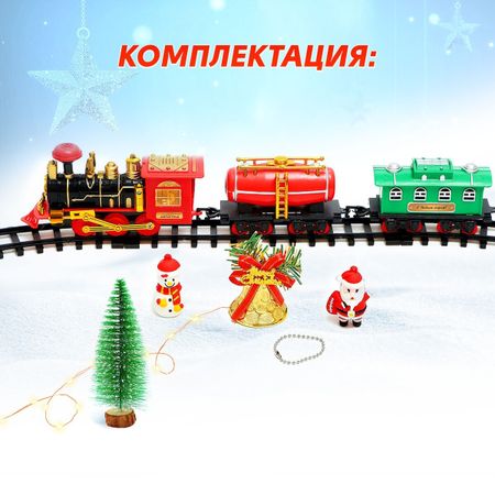 Железная дорога «Новый год», световые и звуковые эффекты, работает от батареек, 3+. Железная дорога «Новый год» привлечет внимание трогательным дизайном и превратит обычную игру в увлекательное праздничное путешествие в мир поездов и чуда! <b> Особенности железной дороги</b> <ul> <li> Детали трассы соединяются и разбираются без особого труда.</li> <li> Все детали выполнены из безопасного гипоаллергенного пластика.</li> <li> Для работы поезда необходимо 2 батарейки типоразмера AA (не входят в комплект), 3 батарейки типоразмера LR44 (входят в комплект).</li> <li> Яркие насыщенные цвета привлекают внимание.</li> </ul> <b> Увлекательно и полезно</b> Управляя вагончиком, ребенок прокачает воображение, координацию движений, разовьет образное и пространственное мышление. Железная дорога «Новый год» рекомендована для детей от 3 лет.