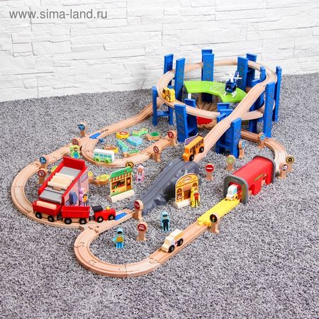 Железная дорога — это красочный набор для сюжетных игр. Большое количество декораций и фигурок позволяет собрать действующий комплекс с транспортной развязкой. Дорожное полотно можно укладывать на уровень выше основного положения рельсов, чтобы организовать многоуровневые съезды и мосты.Детали дорожного полотна выполнены из дерева, что гарантирует их долговечность.Малыш сможет создавать собственные сюжетные линии. Например, перевозить брёвна в сортировочный пункт. Автотрек оснащён вертолётной площадкой, которая расширит игровые возможности для ребёнка.Набор совместим с комплектами ТМ KidKraft, Brio и «Томас и его друзья».В комплект входит98 элементов.4 машинки.6 фигурок людей.Вертолёт.Трёхвагонный поезд без двигателя.Рекомендовано для детей от 3 лет.