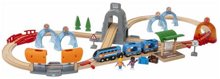 Центром этого набора является синий Smart Tech поезд, который умеет взаимодействовать с самыми разными тоннелями. Например, проезжая через оранжевый тоннель, поезд гудит и мигает фарами. Если же поезд спускается с горки, то он весело присвистывает. Два голубых тоннеля, входящих в набор, имеют прямо противоположные друг другу функции. Проезжая через первый, поезд будто бы ломается, издает звуки аварии и замедляет ход. Но второй голубой тоннель способен его починить и снова вернуть в строй.Тоннель со словом Stop останавливает поезд, а тоннель со стрелкой заставляет локомотив ехать задом наперед. Управлять составом можно при помощи кнопок, расположенных на крыше локомотива, или через специальное приложение для смартфона, которое позволяет записывать и воспроизводить звуковые сигналы поезда и станции, а также менять цвет фар прямо на ходу. Набор складывается в форму восьмерки и включает в себя поезд, вагоны, 5 тоннелей и небольшие аксессуары к дороге. Батарейки: АА/ААА: ААA (2 шт) Не входят в комплект Свет: Да Звук: Да Технология Smart Tech: Да Размер в собранном виде (мм): 1042х485х178 Количество деталей: 37 Возрастная категория: 3 Материал: Дерево, пластик