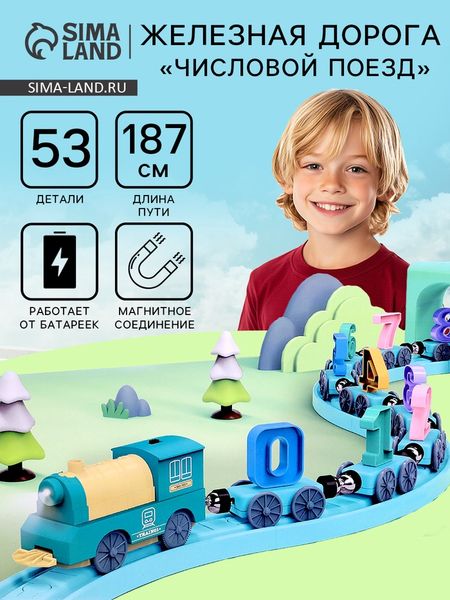 Игрушечная железная дорога станет идеальным подарком для вашего ребёнка. Игрушка «Числовой поезд» развлечёт малыша и поможет в обучении счёту и основам математики.ХарактеристикиВ наборе 16 вагонов поезда со знаками: 10 цифр и 5 математических символов.Магнитное соединение вагонов.Длина пути: 187 см.Игрушка работает от 1 батарейки типа АА (не входят в комплект).У главного вагона светится фара.Длина дороги — 180 см, паровозик ездит вперёд и назад.Из чисел и знаков на вагончиках можно составлять математические примеры.Магнитное соединение вагонов позволяет легко присоединять и отсоединять их, развивая мелкую моторику и координацию движений.Железная дорога стимулирует воображение и творческое мышление, позволяя придумывать различные сценарии и истории. Игрушка способствует развитию логического мышления, внимания и усидчивости.