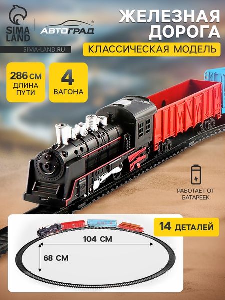 Мечта юного машиниста — разноцветный локомотив! Детская железная дорога со светом — это целый комплект, который подарит ребёнку ощущение настоящего путешествия.Самоходный состав: поезд едет сам — достаточно вставить 2 батарейки АА. Ребёнок почувствует себя настоящим машинистом, наблюдая за движением красочного состава по кругу.Реалистичные детали: ширина колеи 2,4 см, диаметр круга 104×68 см — удобный размер для детской комнаты. Яркая подсветка добавляет игре настоящего железнодорожного колорита.Безопасный материал: все элементы сделаны из прочного пластика без острых краёв.Готов к играм: в коробке найдёшь всё необходимое — локомотив, 4 вагона и гибкие рельсы длиной 57 см. Собери дорогу и отправляйся в путешествие — юный машинист уже готов к работе!