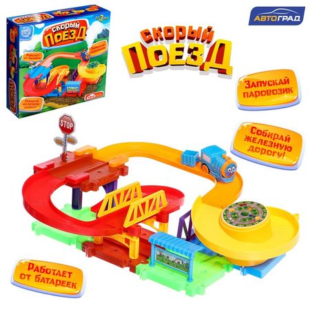 Веселье начинаетсяСовершите захватывающее путешествие по самой яркой и необычной железной дороге. Малыш сам соберёт красочный трек и отправится навстречу приключениям. ОсобенностиДетали трассы легко соединяются и разбираются без особого труда. Разнообразные элементы и локации придадут дополнительный интерес к игре. Паровозик будет двигаться по двухуровневой трассе, заезжать в магазин и киоск и останавливаться на перронах. Как играть? Соберите дорогу согласно инструкции на упаковке.Вставьте в локомотив 1 батарейку типа ААА (входит в комплект). Поместите состав на рельсы и начните игру. Управляя вагонами, мальчишка почувствует себя машинистом, освоит новые социальные роли, а также разовьёт воображение, координацию движений, образное и пространственное мышление. Размер поезда: 5,5 х 2,7 х 3,5 см. Для детей старше 3 лет.