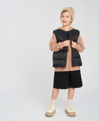 Черный жилет из плащевки не промокает. Утеплитель искусственный пух 150 г на изделие, мягкая трикотажная подкладка и резинка по нижнему краю делают модель идеальной для весны и осени. В утепленной жилетке будет комфортно даже в +10°С. В ней можно отправиться на прогулку, шопинг, в путешествие или на учебу. В карманах ребенок может греть руки или хранить мелочи. Стеганый жилет застегивается на кнопки в тон изделию. Комфортный оверсайз и круглый вырез горловины не сковывают. Для безопасности имеются светоотражающие элементы и адресник, для практичности – немаркий цвет. Дутый жилет универсальный – подходит мальчику и девочке.