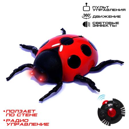 Жук на радиоуправлении «Божья коровка», ползает по стене. <b> Забавы для юных энтомологов</b> Для маленького биолога радиоуправляемая божья коровка станет лучшим подарком. Эта игрушка вызовет у малыша бурю восторга, ведь жук совсем как настоящий: умеет ходить вперед, назад, вправо, влево, двигаться по кругу и даже ползать по стенам и потолку. При этом насекомое ярко светится. С помощью пульта управления ребенок будет контролировать движение божьей коровки, придумывать веселые розыгрыши и увлекательные забавы. <b> Развлекаемся с пользой</b> Игры с радиоуправляемым животным пробудят воображение и фантазию, разовьют координацию движений и пространственное мышление, мелкую моторику и эмоциональное восприятие. <b> Технические характеристики</b> Жук работает от аккумулятора, который заряжается от пульта. Пульт функционирует от 6 батареек типа АА. Приобретаются отдельно. Товар предназначен для детей старше 6 лет.