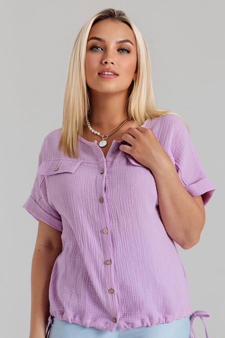 Легкая стильная блузка прямого кроя из муслина, которая отлично сочетается с брюками. Блуза имеет спущенное плечо. Горловина простой О-образной формы. Подходит для работы, отдыха и прогулок, также для беременных. Фирменные лекала гарантируют идеальную посадку на любую фигуру. Застежка-пуговицы. Низ изделия собирается на кулиску. Стирка при 30 градусов.<br> Длина изделия 73 см.<br> Рост модели 164 см.