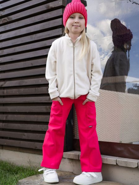 Брюки прямого силуэта из мембраны с флисовой подкладкой сиреневого(фуксия) цвета для девочки. Мембранное покрытие обеспечивает сохранение тепла и воздухообмен . Передние и задние половинки брюк с рельефами, в рельефные швы вставлены вместительные карманы , рельефы отстрочены отделочной строчкой. Пояс составной — передняя часть из основного материала, боковая и задняя часть пояса — из кашкорсе. Низ брюк прямой.