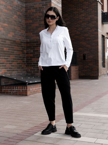 Женские брюки свободногог силуэта из футера черного цвета зауженные к низу, с боковыми карманами, с застежкой на молнию и кнопки. На задних половинках брюк имитация прорезных карманов с листочкой. Трикотажные бананы свободного силуэта — идеальная одежда для тех, кто ценит стиль и комфорт. Широкий диапазон размеров: подойдут от подростков до беременных и девушек в зрелом возрасте. Ткань мягкая и легкая, с высоким содержанием хлопка, поэтому брюки не сковывают движения и подойдут практически для любого случая: как для повседневного ношения, так и для работы в офисе или на праздник. Изделие выполнено из трикотажа премиального качества — ПЕНЬЕ, с содержанием хлопка более 92%