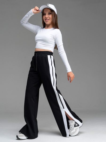 Брюки -палаццо из футера черного цвета для девочкисвободного силуэта с лампасами — это идеальное сочетание комфорта, качества, стиля и практичности. Спортивные брюки для девочки выполнены из футера 2х нитки высшего качества Пенье. Брюки для девочки имеют следующий состав ткани — 92% хлопок, 8% полиэстер. Детские брюки имеют стильные лампасы, нижняя часть которых с разрезом. Спортивные детские летние штаны с боковыми карманами устойчивы к образованию катышек. Одним из ключевых преимуществ брюк — отсутствие утепления, начеса и флиса. Это означает, что Ваш ребенок может носить их весной и летом. Спортивные брюки для девочки комфортны в школу на физкультуру как спортивная форма, для занятия спортом, как одежда для подростка, для дома- как домашняя одежда. Стильные широкие штаны для девочек подходят для танцев, хип хоп и других направлений. Брюки современного свободного кроя с удобной посадкой. Летние трикотажные спортивные штаны станут отличным подарком по любому поводу. Изделие выполнено из трикотажа премиального качества — ПЕНЬЕ, с содержанием хлопка более 92%