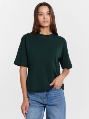 Эта женская футболка оверсайз из кулирки станет отличным дополнением вашего гардероба. Горловина круглой формы, спущенное плечо и углубленная пройма создают