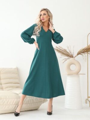 <div>Изящное платье полуприлегающего силуэта из трикотажного полотна темно-зеленого цвета. V-образный вырез изделия обработан внутренней обтачкой.