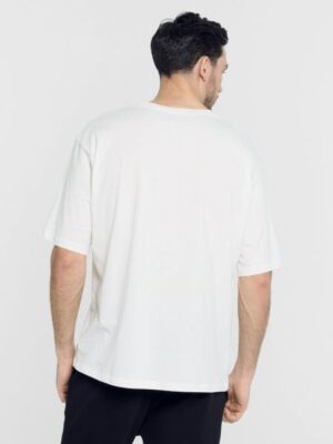 Футболка мужская из футера белого цвета свободного силуэта с короткими рукавами,круглая горловина обработана рибаной. Изделие выполнено из трикотажа премиального
