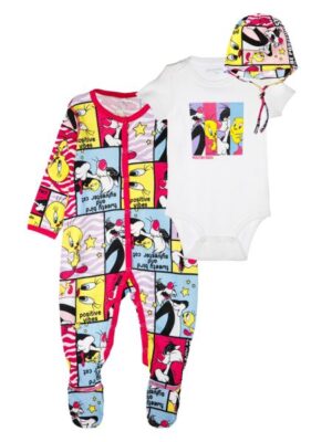 Комплект: боди, комбинезон, шапочка. Боди имеет два ряда кнопок, чтобы расти вместе с малышом. Комбинезон со следочками. Застежка на кнопки.