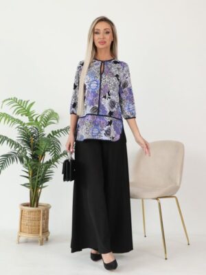 Обворожительный джемпер-туника свободного силуэта из трикотажного полотна сиреневого цвета. Круглый вырез изделия обработан окантовкой и дополнен вырезом