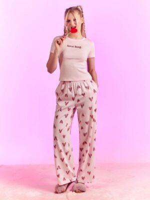 Женская пижама для комфортных домашних образов включает в себя приталенную футболку с круглым вырезом горловины и короткими рукавами, а также брюки свободного