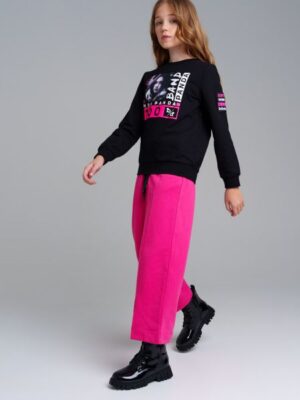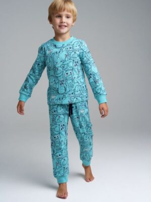 Пижама: свитшот и брюки из трикотажа. 100% хлопок. На брюках эластичный пояс со шнурком. Эластичные манжеты по рукавам и низу брюк. PLAYTODAY