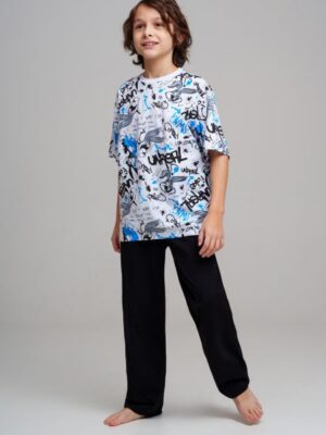 Пижама для мальчика подростка. Футболка и брюки из эластичного и приятного на ощупь трикотажа. Штаны на резинке со шнурком. Функциональные карманы.