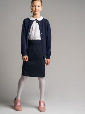 Классический синий школьный кардиган для девочки подростка. Кардиган прямого силуэта на пуговицах выполнен из вязаного трикотажа с высоким содержанием хлопка.