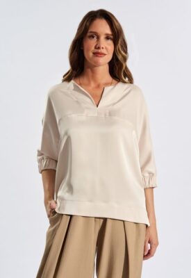 Очаровательная дизайнерская блузка с цельнокроеным рукавом от D’imma Fashion Studio из натуральной ткани. Модель с круглым вырезом с разрезом по центру